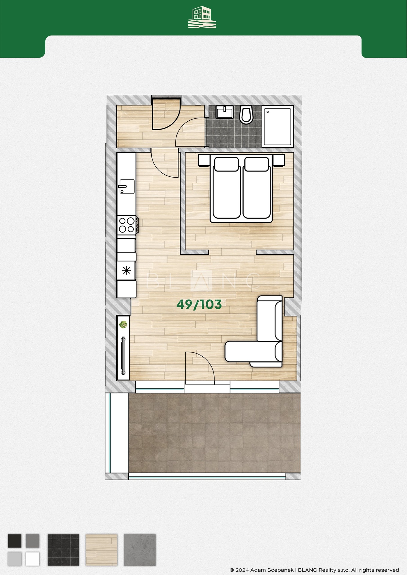 Nabízíme moderní, plně vybavený apartmán o dispozici 2+kk s terasou a celkové ploše 62,46 m², který se nachází v